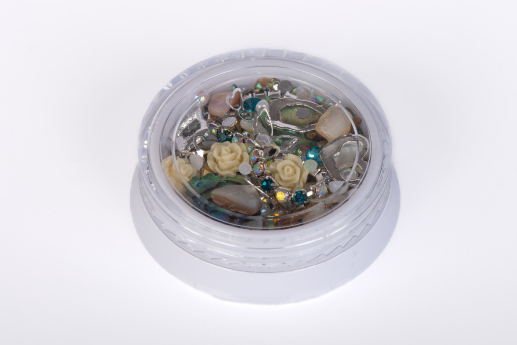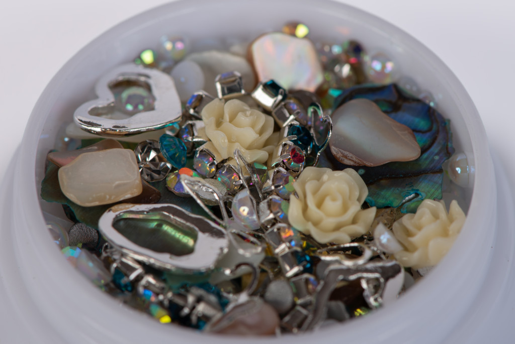 Eine faszinierende Nagelverzierung aus Strass, Perlen und anderen dekorativen Elementen, die mit Überlagerungen, Einbettungen, Perlen, Diamanten und vielen anderen wunderbaren Möglichkeiten atemberaubende Möglichkeiten für das Nageldesign bietet.
